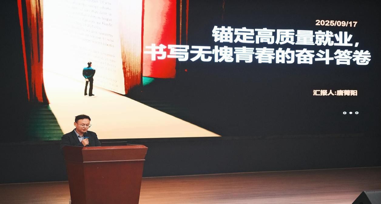 最后,唐菁阳博士以“锚定高质量就业,书写无愧青春的奋斗答卷”为题,将个人成长策略融入大学四年规划。他提出“第一年认知探索、第二年学习积淀、第三年实践创新、第四年冲刺飞跃”的进阶路径,鼓励新生从入学起就树立目标,通过积累与实干,最终实现从新生到精英的蜕变。