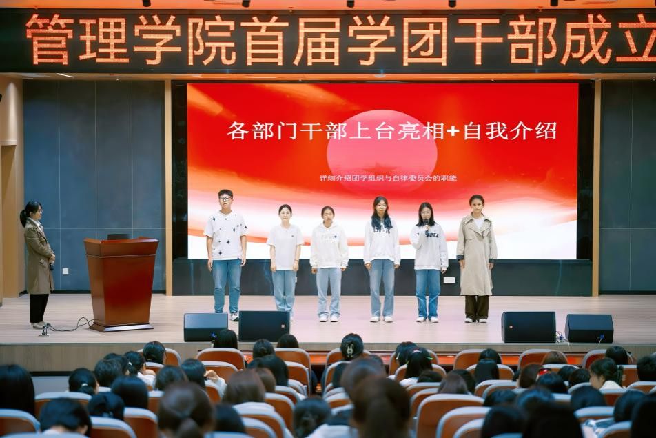 在上台亮相和自我介绍环节中,新任职的学团干部代表们表示,将以此次成立大会为全新起点,牢记服务同学的初心,不断提升自身工作能力,在学风建设、文体活动、志愿服务等多个领域深耕细作,致力打造一系列有温度、有活力的团学品牌活动,让每一位同学都能收获成长、绽放光彩。
