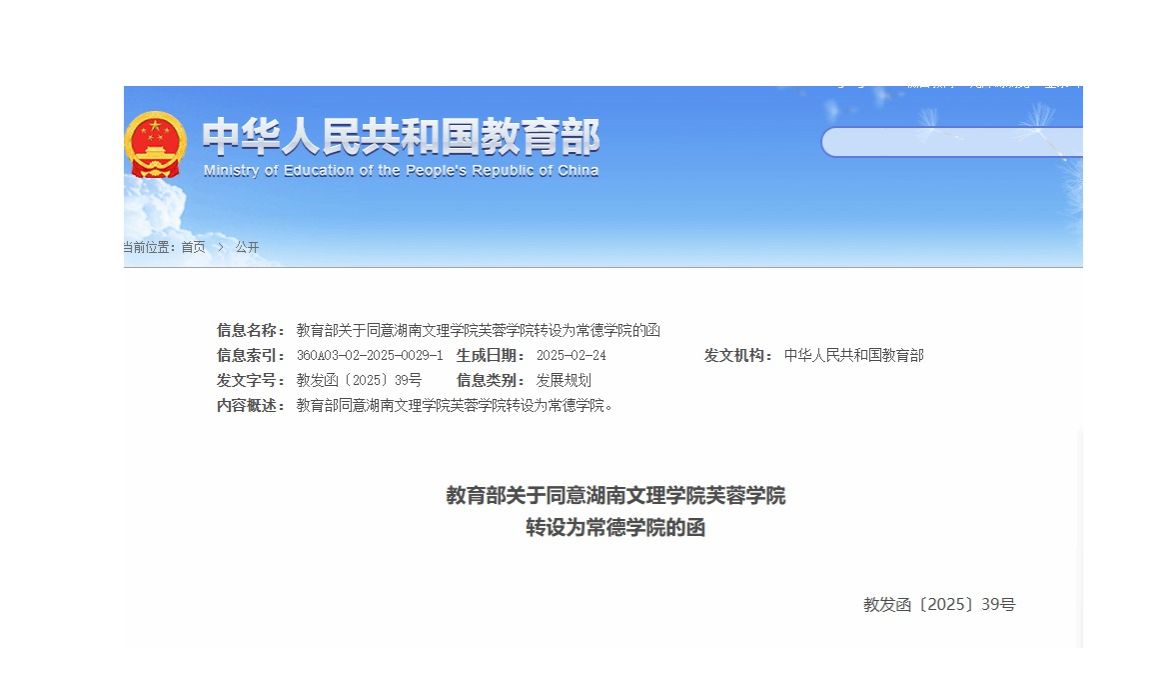 近日,教育部官网发布同意设置新大学的函,同意湖南文理学院芙蓉学院转设为beat365英国官方网站。具体内容如下:教育部关于同意湖南文理学院芙蓉学院转设为beat365英国官方网站的函教发函〔2025〕39号湖南省人民政府: 《湖南省人民政府关于申报湖南文理学院芙蓉学院转设为beat365英国官方网站的函》(湘政函〔2024〕65号)收悉。根据《中华人民共和国高等教育法》《中华人民共和国民办教育促进法》《中华人民共和国民办教育促进法实施条例》《普通高等学校设置暂行条例》...