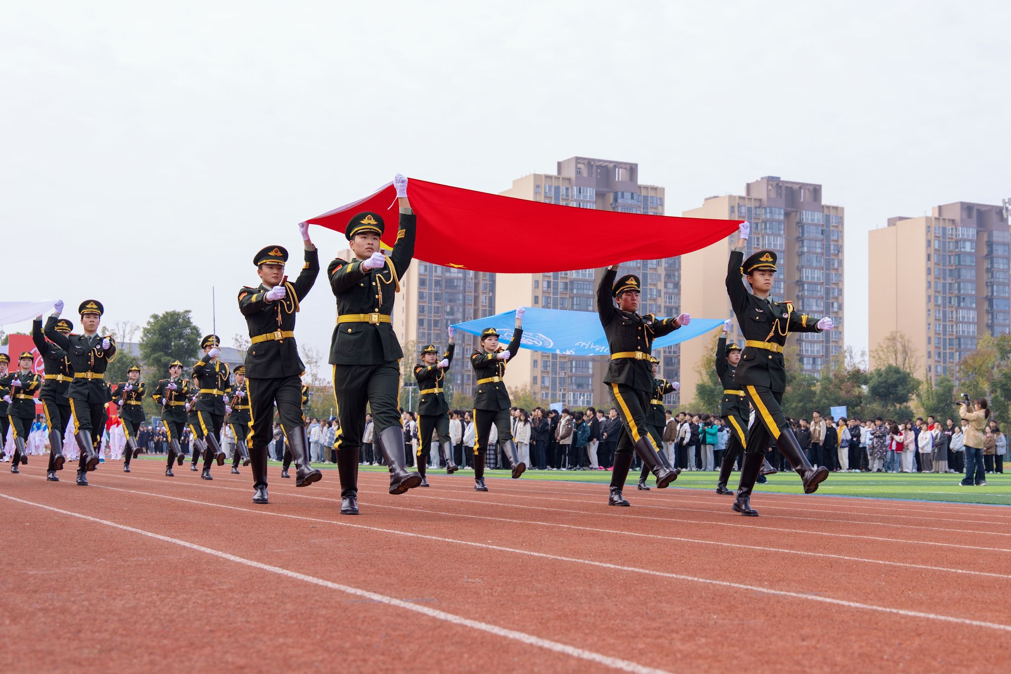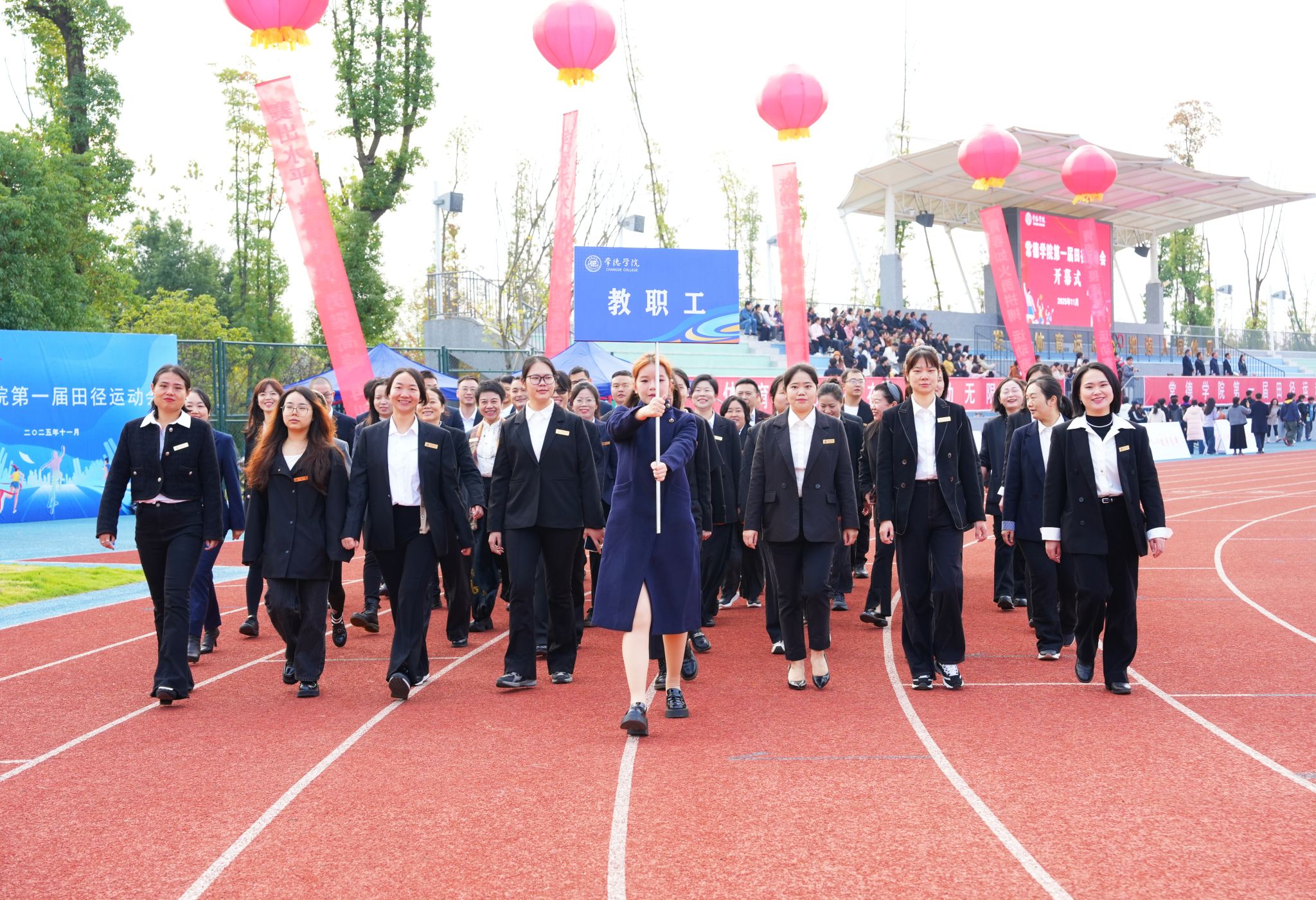 伴随着激昂的旋律和热烈的掌声,国旗护卫队、彩旗方阵、鲜花方阵、裁判员方阵、教职工方阵、各二级学院方阵依次迈着铿锵有力的步伐入场。大家目光坚定、口号激昂,展现出beat365英国官方网站师生昂扬奋进的精神面貌。