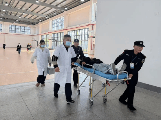 上午11时,灭火疏散演练在南区体育馆正式启动。随着手动火灾报警器被触发,烟雾弹拉开,模拟体育馆因电器短路引发“火情”。消控室立即播放疏散广播,提醒师生保持镇定,带好贵重物品,从就近消防通道有序疏散。疏散组在孔勇波的带领下,于楼梯口、拐角处等关键位置引导师生用湿毛巾捂住口鼻,低姿弯腰快速撤离;灭火组同步行动,连接消防水带、使用灭火器对“火源”展开扑救;警戒组维持现场秩序,救护组在集结地设置救护点待命,保障组全程做好物资保障与宣传记录。11时15分,所有参与人员安全撤离至田径场,各小组迅速清点人数并汇报,整个演练过程紧张有序、协同高效。