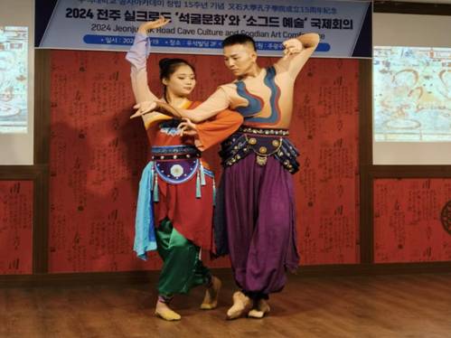 会议期间,来自中国、韩国、日本、乌兹别克斯坦等国家的学者就丝绸之路沿线考古、艺术等主题进行探讨和交流。姚岚与韩国中央大学音乐学院名誉教授全仁平就中、日、韩三国的“般涉调”进行分享和讨论。舞蹈教师史朋伟和李琪与韩国“盘索里”表演艺术家开展深度交流,并表演舞蹈《胡腾乐韵》《柘枝舞》《胡旋舞•镜络》,受到了中国驻韩国光州总领事顾景奇和与会专家们的高度好评。