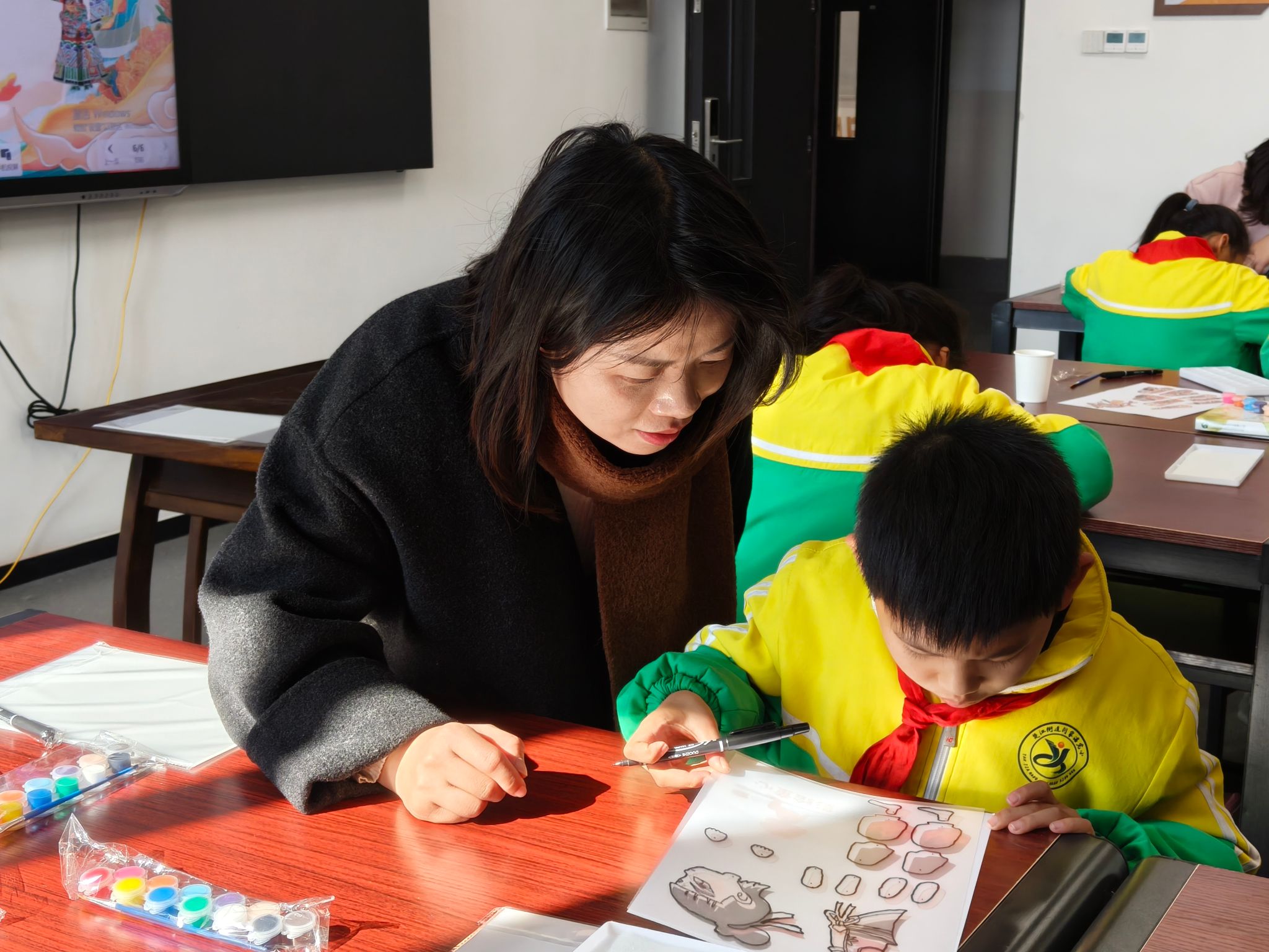 “大家看,先勾勒轮廓,再裁剪细节,最后上色粘贴,一个皮影人物就做好了!”在皮影制作体验区,项甜甜、孟琴等老师耐心指导,高校大学生与小学生结对合作,围坐桌前专注地画轮廓、剪纹样、粘皮影。从选材到成型,孩子们亲手触摸皮影的质感,近距离探秘这项古老技艺的“前世今生”,在指尖的创作中感受非遗工艺的匠心与温度。