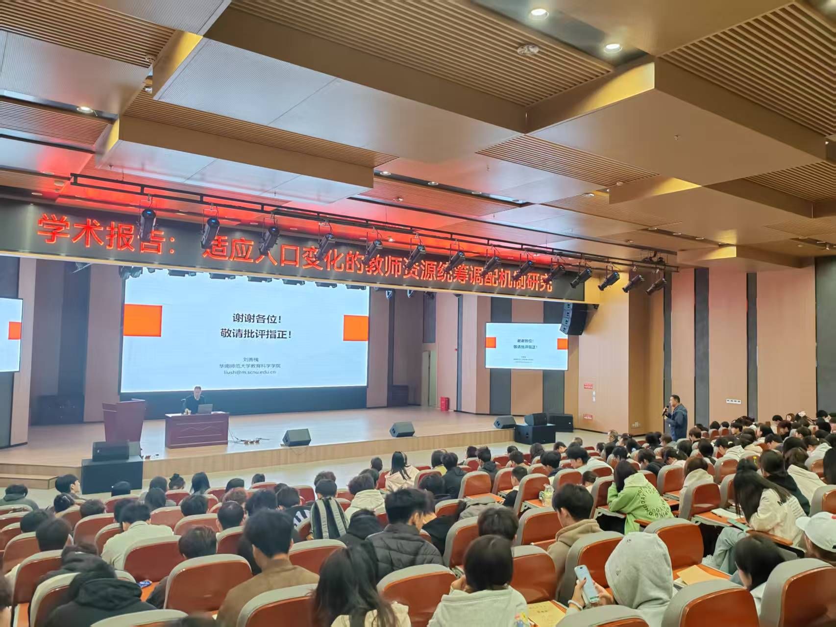 本次学术报告在图书馆第一报告厅举行,由教育学院承办。教育学院院长李尚群教授主持了本次学术报告会。学校主管教学和科研工作的副校长李玉民教授,科研处处长唐松林教授,教育学院全体教师,湖南文理学院部分教师,刘善槐教授调研团队,以及教育学院2025级全体学生等共计400余人聆听了本次学术报告。主题报告结束后,刘善槐教授与师生进行了现场交流,回答了多个专业性问题。