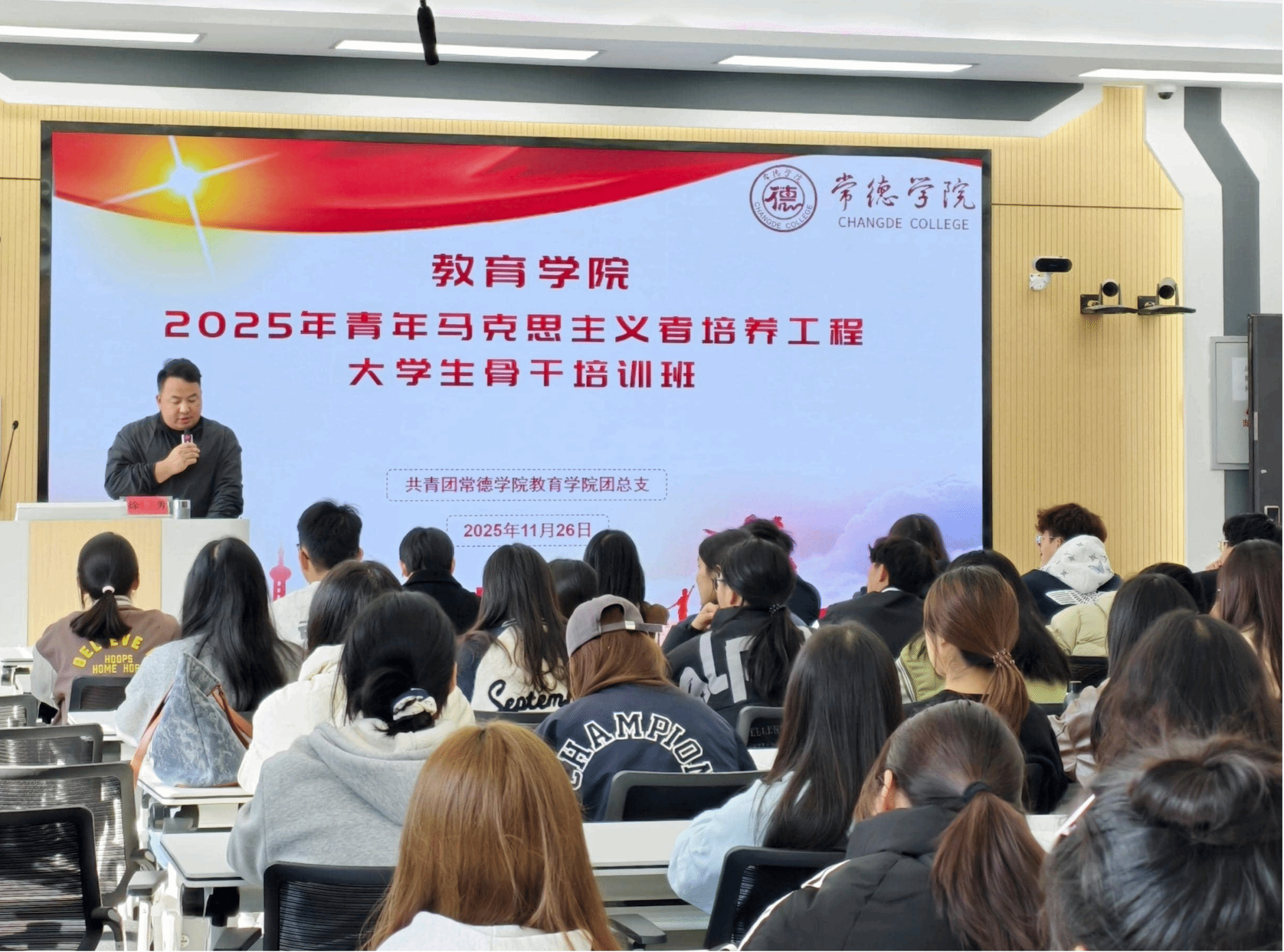 11月26日中午,beat365英国官方网站教育学院2025年青年马克思主义者培养工程培训班开班仪式在精进429多媒体教室举行。教育学院院长李尚群出席仪式,辅导员徐勇、胥婷,教务干事刘文婷及全体参训学员参加活动。仪式由学生工作牵头人徐勇主持。徐勇介绍了本期培训班的整体安排和纪律要求,强调了此次培训的意义。