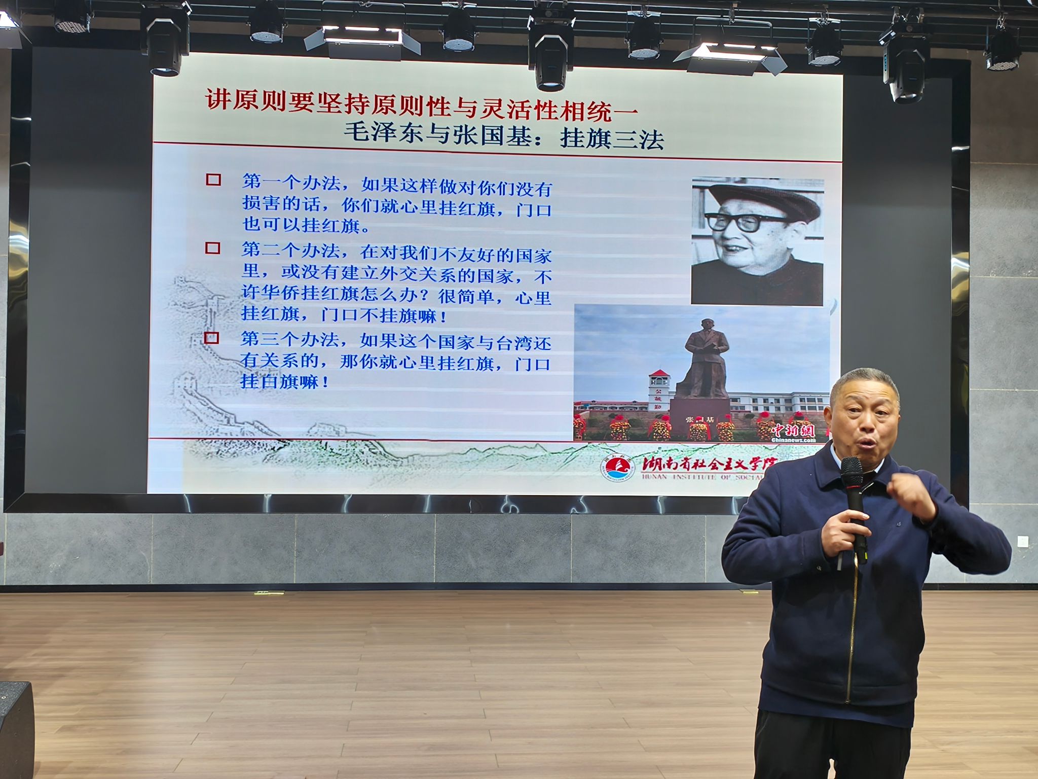 在学校筹建发展迈入新阶段的关键时期,为了全面提升教职工队伍政治素养、强化纪律观念与团队协作能力,2月18日上午,根据学校指示,马克思主义学院特邀原湖南省社会主义学院党组成员、副院长、一级巡视员、全国知名统战理论专家周述杰教授,来beat365英国官方网站为全体教职工开展题为“讲政治 讲原则 守纪律”的专题讲座。周述杰教授认为,讲政治讲原则守纪律是凝心聚力推进强国建设民族复兴伟业的根本要求,是应对世情国情党情变化的必然要求,...