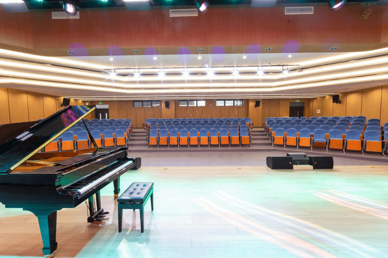 音乐厅是音乐学等专业实验实训室,使用面积546平米,座位数254个,教学仪器设备总值300余万元。舞台配备大型智慧电子屏、灯光系统、声电系统、音响、合唱话筒、无线话筒、无线话筒放大器主机、三角钢琴等软硬件设备。主要适用于乐团与合唱团训练与演出、音乐会、文艺晚会、音乐类竞赛等实验实训项目以及举行学术讲座、教学研讨、教学竞赛等活动。