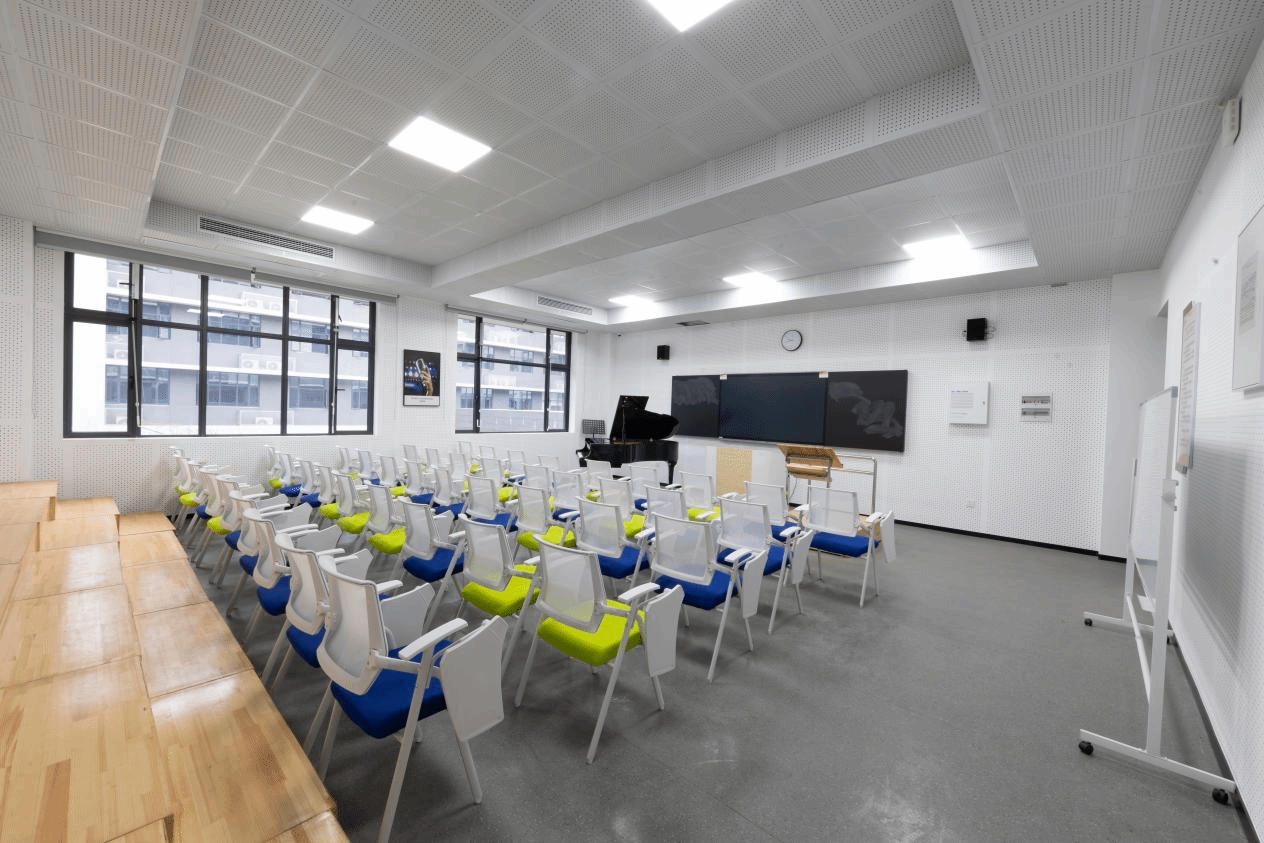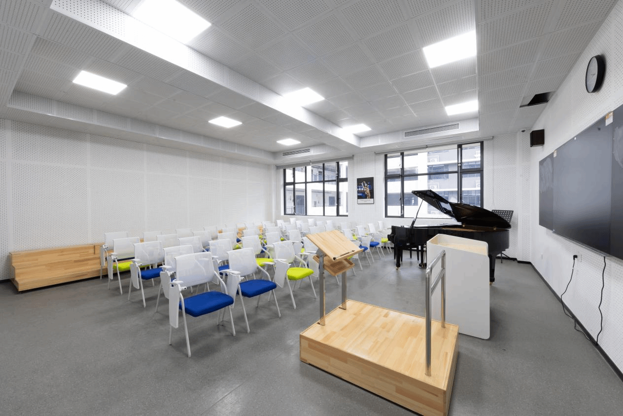 合唱教室是音乐学专业实验实训室,共2间,使用面积162平米,可同时容纳90人进行实验实训。配备三角钢琴、智慧黑板、合唱阶梯、指挥台、合唱麦、音箱等设备设施。主要适用于声部训练、合唱训练、指挥训练等实验实训项目。