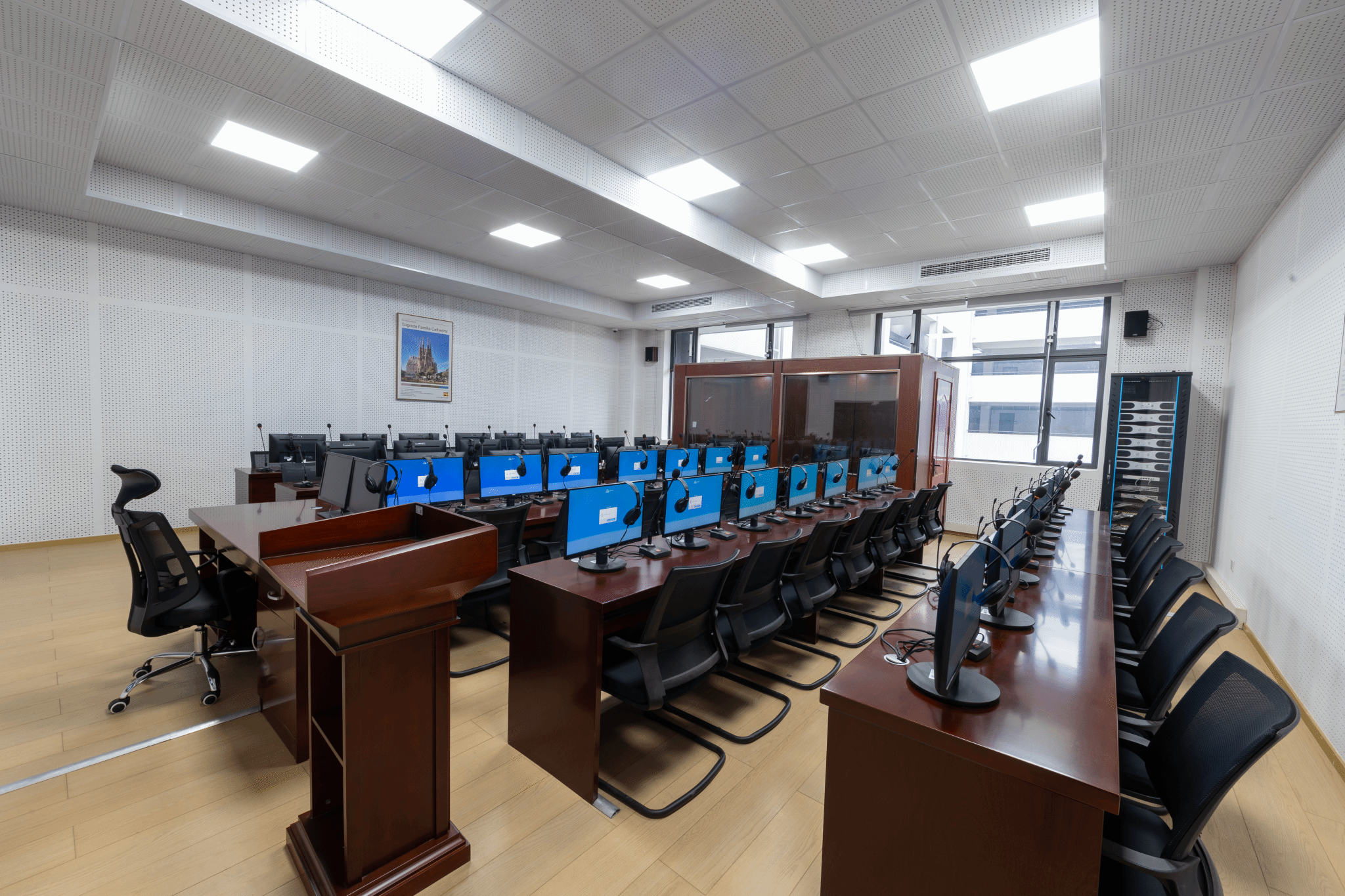 同声传译室是英语专业实验实训室,使用面积81平米,可同时容纳45人进行实验实训。配备云桌面虚拟化服务软件、语言学习译员终端、同传技能教学平台、交传技能教学平台、专业同传会议系统、86寸纳米智慧黑板等软硬件设备。主要适用于英汉/汉英口译、同声传译、交替传译、商务翻译、演讲与辩论等实验实训项目以及开展国际会议、翻译研究、国际交流等活动。