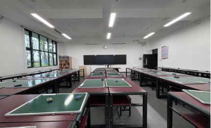 书法室是语言及师范类专业实验实训室,使用面积162平米,可同时容纳80人进行实验实训。配有智慧黑板、书法临摹桌、书法教学软件、书画教学展示台、书法教学直播系统、书法字帖排版系统、书法集创系统等软硬件设备。适用于三笔字训练、书写示范、书法欣赏、书写临摹、书法史讲座、书法竞赛等实验实训项目