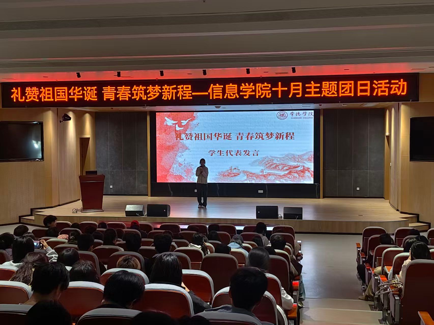 (活动现场)为热烈庆祝中华人民共和国成立76周年,进一步激发广大团员青年的爱国热情与时代担当,厚植家国情怀,践行“强国有我”的青春誓言,信息学院于2025年10月28日下午在图书馆第二学术报告厅隆重举行“礼赞祖国华诞,筑梦青春新程”十月主题团日活动。本次活动由信息学院团支委精心组织,相关辅导员及全院团员共同参与。活动在庄重而热烈的氛围中拉开帷幕。主持人伍嘉文同学首先围绕主题进行开场发言,他强调全体团员应深刻铭记新中国76年来的辉煌历程与伟大成就,...