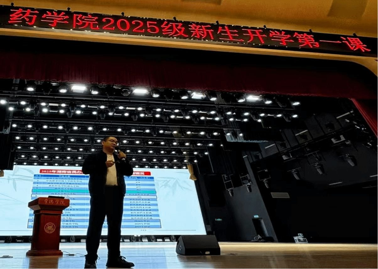 2025年9月23号晚上18:30药学院于精彩楼礼堂隆重举办了一场意义非凡的开学第一课活动。这场精心筹备的盛会,不仅是新生们正式踏入大学药学殿堂的重要里程碑,更是学院为身打造的“他们量启航指南”,旨在帮助新生们快速适应大学节奏,明确专业方向,深度激发对专业领域的探索欲与求知欲。活动现场气氛热烈,座无虚席。党支部书记唐松林、药学院副院长杨志勇担任主要发言人,学院老师共同参与了此次意义深远的开学第一课。党总支书记唐松林率先走上讲台,...