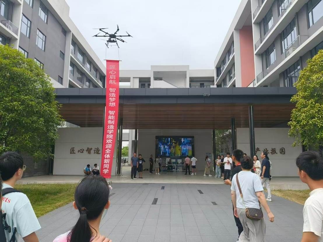 本次迎新的最大亮点位于学院大厅门口的核心展区。一架载重高达60公斤的六旋翼中型工业无人机悬停在空中,稳稳地牵引着“匠心启航,智造梦想,智能制造学院欢迎全体新同学”的巨幅标语,以其强大的性能和稳定的悬停技术,象征着学院坚实的技术基础和对新同学“重磅”的欢迎与承载。