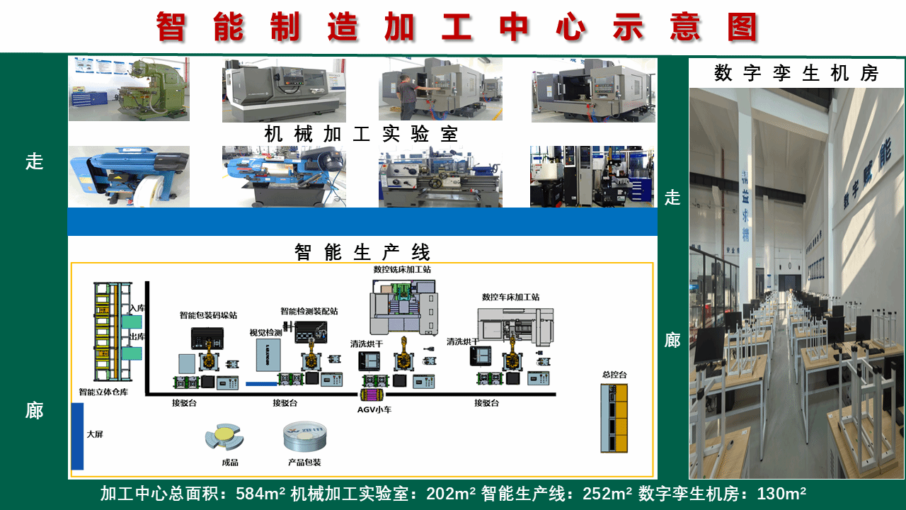 核心设备:六轴工业机器人、AGV智能搬运系统、MES生产管理系统、智能视觉检测单元、数字孪生仿真平台、四轴立式加工中心等。